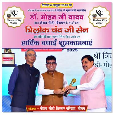 प्रदेश के मुखिया डॉ. मोहन यादव द्वारा नीमच केशव सीटी विस्तार के डायरेक्टर एवं सेन समाज के वरिष्ठ श्री त्रिलोकचंद जी सेन को तीसरी बार सम्मानित करने पर बधाई एवं उज्जवल भविष्य की कामनाए। केशव सीटी विस्तार परिवार नीमच की और से सेन समाज के वरिष्ठ श्री त्रिलोकचंद जी सेन को उज्जवल भविष्य की कामनाएं।
